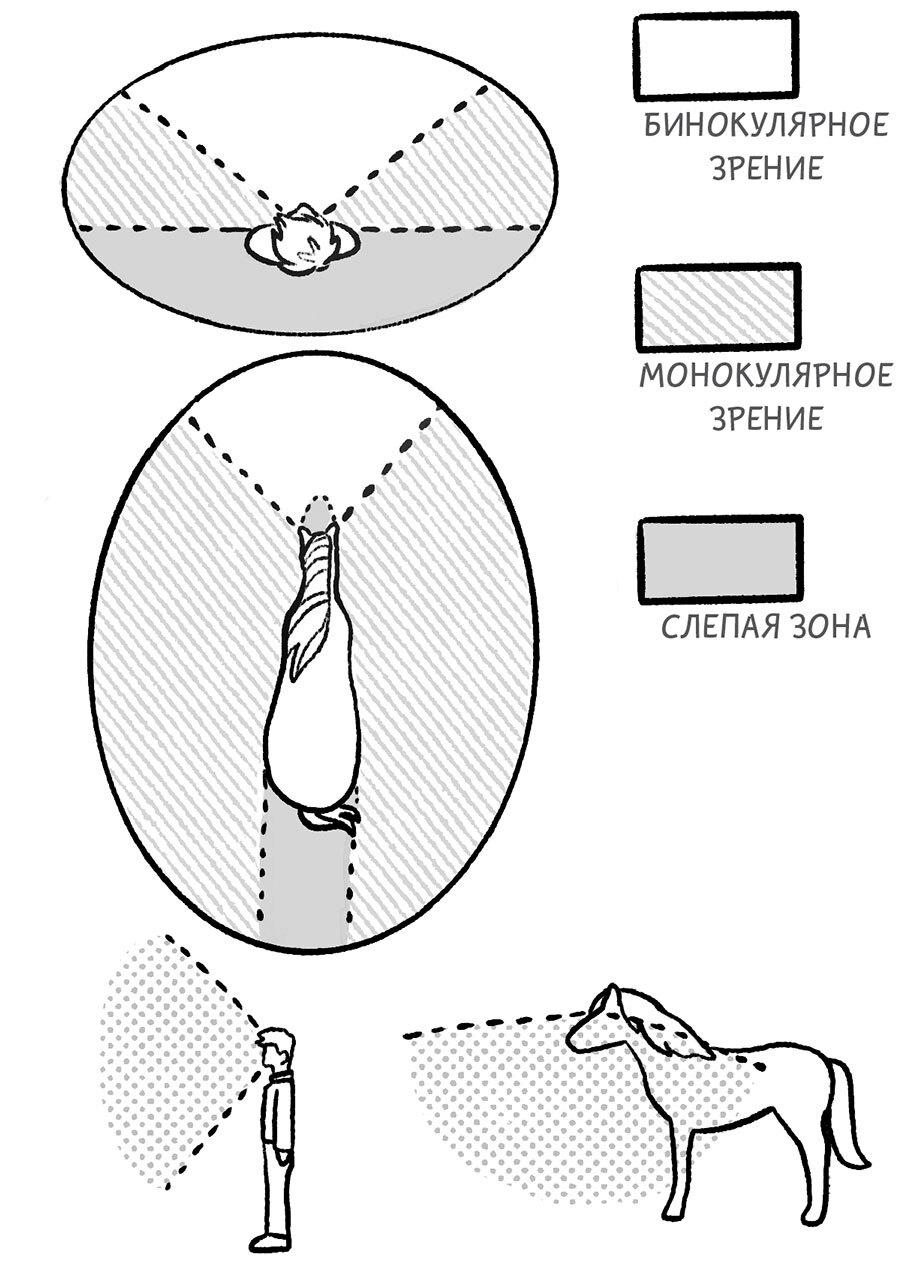 Лошади видят практически на 360°. Небольшая слепая зона находится прямо за хвостом, но и ее лошадь может мгновенно перекрыть, лишь слегка повернув голову. И монокулярным зрением (одним глазом) лошадь отлично контролирует все боковое поле с каждой стороны. Им не нужно поворачивать голову, чтобы увидеть, что происходит по сторонам.
