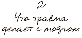 В этой главе мы поговорим о том, как травматический опыт влияет на людей на уровне мозга и нервной системы. Мы постараемся рассказать, как работают наши реакции страха и как под влиянием травматического опыта этот слаженный и мощный механизм защиты от опасностей сам становится главной угрозой. Это важно, поскольку, если вы понимаете, как травма влияет на мозг и откуда берутся симптомы посттравматического расстройства, происходящее с вами как минимум перестает выглядеть необъяснимым страшным хаосом. Если симптомы хорошо изучены, вам будет проще осознать, что их можно вылечить.