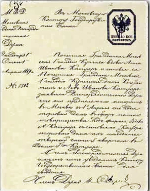 Из приводимого ниже документа от 8 апреля 1869 года явствует, что к тому времени Анна Ивановна и ее сыновья имели звания почетных граждан и купцов 1-й гильдии: «В Московскую контору Государственного банка. Почетная Гражданка Московской Гильдии купчиха вдова Анна Иванова Катуар и сыновья ея Почетные Граждане Московския 1 гильдии купеческие дети Константин и Лев Ивановичи Катуар за явили Распорядительной Дирекции, что они предположили открыть в Москве 1 апреля сего года торговый дом в образах полного товарищества под фирмою: вдова А. Катуар с сыновьями. Контора торгового дома их находится в Тверской части 5 квартала в доме [нрзб.] Катуары. О чем Распорядительная Дума имеет честь уведомить контору Государственного банка для сведения.