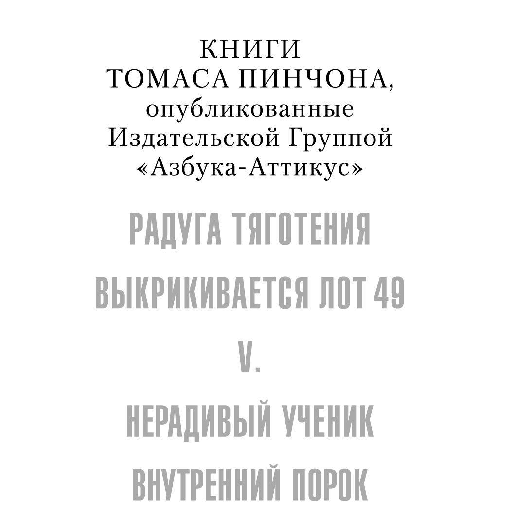 Переводчик благодарен первому редактору перевода этого романа Шаши Мартыновой, Владимиру Беленковичу, конкордансу PynchonWiki (за внимательность при чтении этой книги) и участникам списка рассылки Pynchon List (за дельные советы).