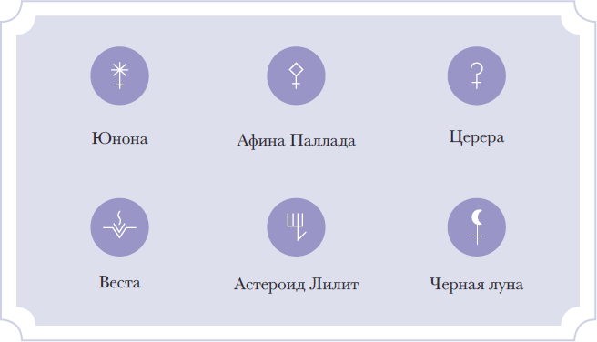 Как я уже упоминала, существуют десятки тысяч астероидов. Здесь мы работаем с первыми четырьмя из открытых, а также с астрологической точкой, символизирующей Лилит.