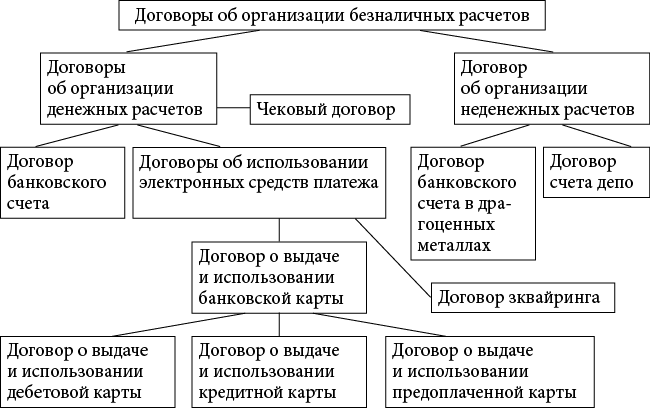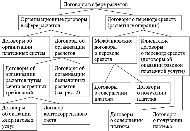 • договоры, непосредственно направленные на совершение или получение платежа (расчетные операции), и — организационные договоры в сфере безналичных расчетов, целями заключения которых являются организация будущих безналичных расчетов и согласование общих условий расчетных операций, которые предполагается совершать в будущем.