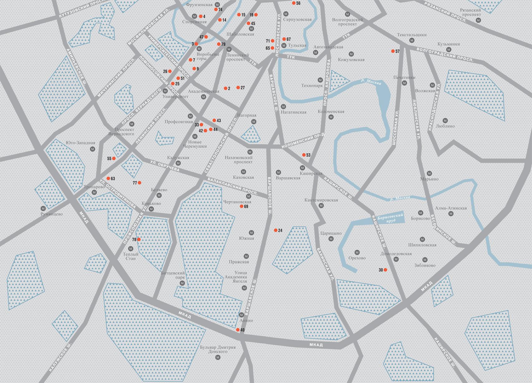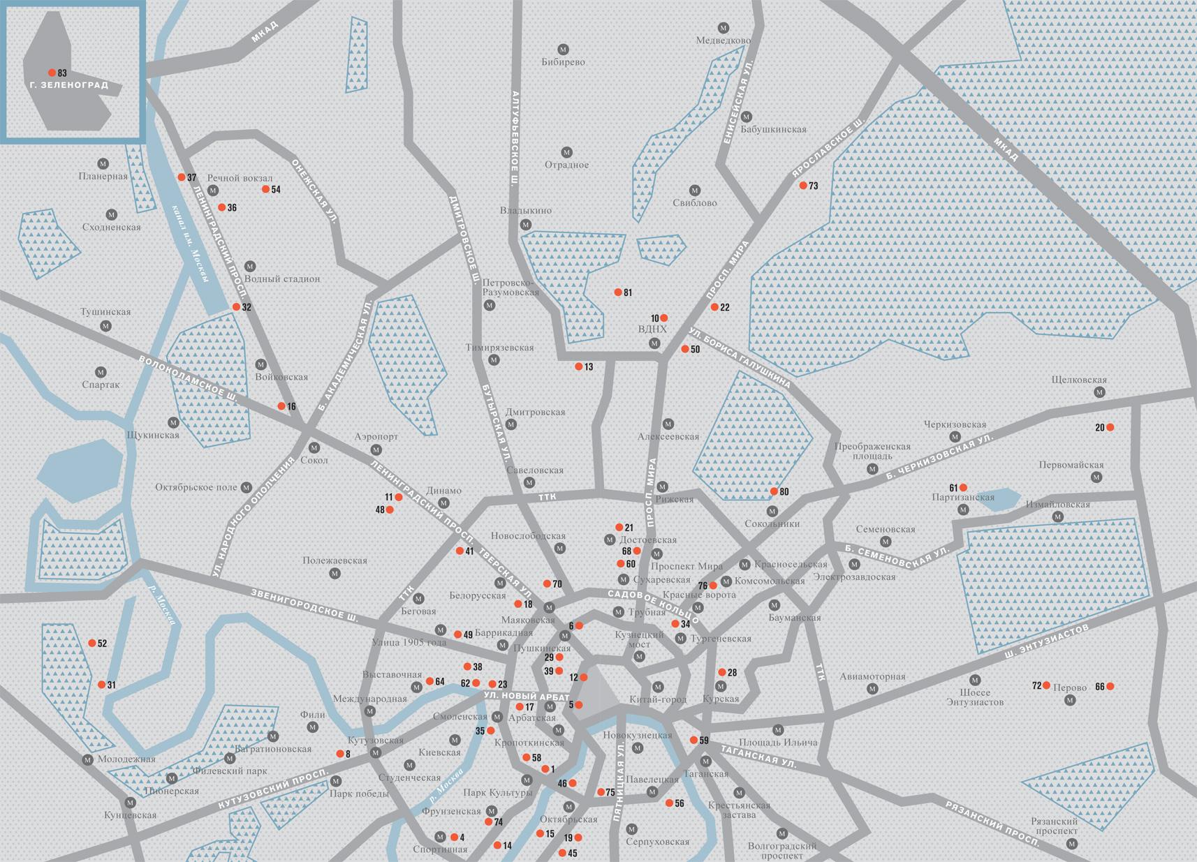 Выстроив книгу в соответствии с хронологией, мы столкнулись с другой проблемой: что делать с ВДНХ[81], Сокольниками[80], Зеленоградом[83], где соседствуют здания разных десятилетий, подчиненные одной идее и образующие вполне единый не ансамбль, но комплекс? Присовокупив к ним станции метро того же времени[82], мы вынесли эти 4 территории в отдельные сюжеты и разместили их в конце, немного испортив стройное течение времени в книге. Вероятно, мы не идеально разрешили перечисленные выше проблемы, и вообще вопросов к книге будет много. «А почему здесь нет Института имени Вишневского или Уголка Дурова?» — спросит нас дотошный москвич и будет по-своему прав. На это мы можем только ответить, что в изначальном списке зданий было в два раза больше! Но отдадим должное издателю, который мудро побуждал нас к самоограничению, призывая выбирать не только красивое и любимое, но самое характерное. И если уж мы брали кинотеатр «Россия»[6], то жертвовали «Первомайским» и «Ереваном», а выбрав МИСИ[73], с грустью откладывали МИСИС.