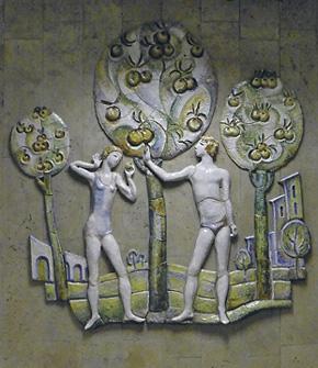 А там, где у Топаза был гардероб, сделали остекленное кафе, практически в уровне с водой — еще одна чудесная находка в духе 60-х, но и память о ротонде, имевшей тот же овальный план. А деревянные трибуны как были, так и остались, и по сей день используются не только по прямому назначению, но и как лучшее в центре Москвы место для загорания. И откуда так хорошо обозревается старообрядческий храм в Турчаниновом переулке, расположенный, слава богу, не на месте бассейна, а ровно напротив. Откуда, в свою очередь, совершенно не виден «срам» — керамический горельеф Аделаиды Пологовой в коридоре бассейна: два молодых человека под яблоней — Адам в плавках и Ева в купальнике.