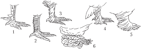 Цевки кур: 1 – гладкая пятипальцевая цевка; 2 – цевка с редким «чулочком»; 3 – цевка с густым «чулочком»; 4 – «штаны» – удлиненные кроющие перья голени; 5 – среднемохноногая цевка; 6 – сильномохноногая цевка