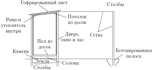 Сезонный курятник можно построить по следующему принципу: размер курятника – 1×2 м, размер выгула – 2×2 м. На указанных расстояниях закопать столбы высотой 2,5 м, два столба, образующие заднюю стенку, поставить чуть ниже, чтобы был скат. С помощью болтов, продетых через отверстия на высоте 25 см от земли, закрепляют с внутренней стороны деревянную рамку. На рамку настилают доски – это пол. Пол с нижней стороны просмоляют битумом, а дальше следуют снизу вверх камень (щебень и галька) и солома.