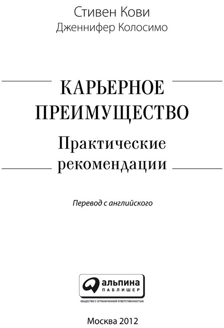 Карьерное преимущество: Практические рекомендации / Стивен Кови, Дженнифер Колосимо; Пер. с англ. — М.: Альпина Паблишер, 2012.