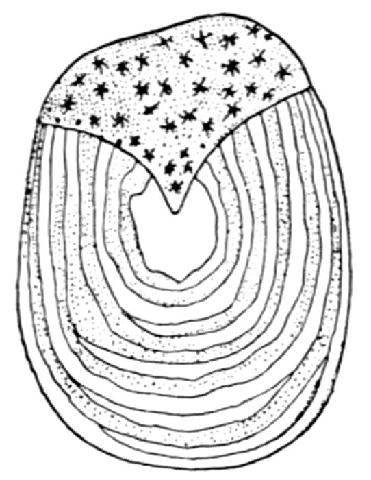 The process of the development of the germ-layers in Teleosts appears as an abbreviated one, although in many of its details it is but imperfectly known. In the development of the medullary groove, as an example, the following peculiarities exist: the medullary region is but an insunken mass of cells without a trace of the groove-like surface indentation. It is only later, when becoming separate from the ectoderm, that it acquires its rounded character; its cellular elements then group themselves symmetrically with reference to a sagittal plane, where later, by their dissociation, the canal of the spinal cord is formed. The growth of the entoderm is another instance of specialized development. In an early stage the entoderm exists in the axial region, its thickness tapering away abruptly on either side; its lower surface is closely apposed to the periblast; its dorsal thickening will shortly become separate as the notochord. In a following stage of development the entoderm is seen to arch upward in the median line as a preliminary stage in the formation of the cavity of the gut. Later, by the approximation of the entoderm-cells in the median ventral line, the condition is reached where the completed gut-cavity exists.