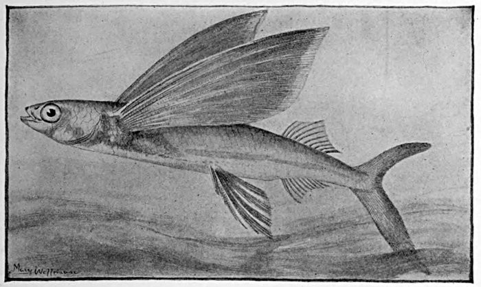 Flight of Fishes.—Some fishes called the flying-fishes sail through the air with a grasshopper-like motion that closely imitates true flight. The long pectoral fins, wing-like in form, cannot, however, be flapped by the fish, the muscles serving only to expand or fold them. These fishes live in the open sea or open channel, swimming in large schools. The small species fly for a few feet only, the large ones for more than an eighth of a mile. These may rise five to twenty feet above the water.