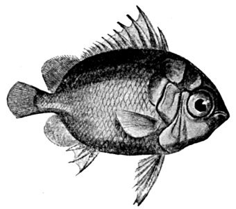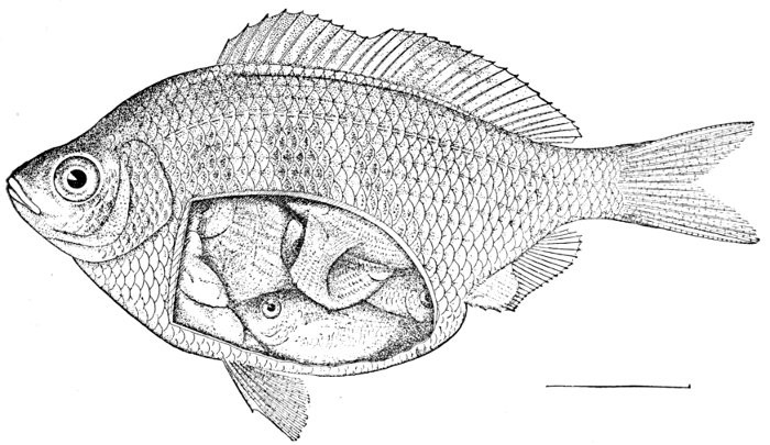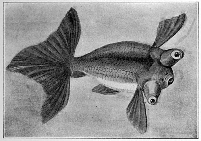 Monstrosities among Fishes.—Monstrosities are rare among fishes in a state of nature. Two-headed young are frequently seen at salmon-hatcheries, and other abnormally divided or united young are not infrequent. Among domesticated species monstrosities are not infrequent, and sometimes, as in the goldfish, these have been perpetuated to become distinct breeds or races. Goldfishes with telescopic eyes and fantastic fins, and with the green coloration changed to orange, are reared in Japan, and are often seen in other countries. The carp has also been largely modified, the changes taking place chiefly in the scales. Some are naked (leather-carp), others (mirror-carp) have a few large scales arranged in series.