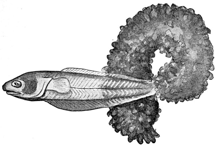 Fig. 121.—Pearl-fish, Fierasfer acus (Linnæus), issuing from a Holothurian. Coast of Italy. (After Emery.)