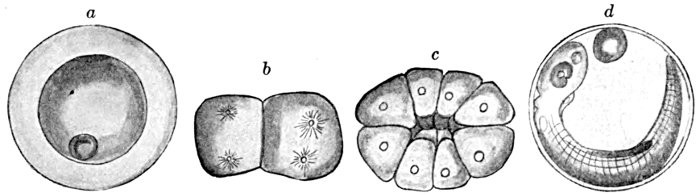 General Laws of Development.—The general law of development may be briefly stated as follows: All many-celled animals begin life as a single cell, the fertilized egg-cell; each animal goes through a certain orderly series of developmental changes which, accompanied by growth, leads the animal to change from single-cell to many-celled, complex form characteristic of the species to which the animal belongs; this development is from simple to complex structural condition; the development is the same for all individuals of one species. While all animals begin development similarly, the course of development in the different groups soon diverges, the divergence being of the nature of a branching, like that shown in the growth of a tree. In the free tips of the smallest branches we have represented the various species of animals in their fully developed condition, all standing clearly apart from each other. But in tracing back the development of any kind of animal we soon come to a point where it very much resembles or becomes apparently identical with some other kind of animal, and going farther back we find it resembling other animals in their young condition, and so on until we come to that first stage of development, that trunk stage where all animals are structurally alike. Any animal at any stage in its existence differs absolutely from any other kind of animal, in this respect: it can develop into only its own kind. There is something inherent in each developing animal that gives it an identity of its own. Although in its young stages it may be indistinguishable from some other species of animal in its young stages, it is sure to come out, when fully developed, an individual of the same kind as its parents were or are. The young fish and the young salamander may be alike to all appearance, but one embryo is sure to develop into a fish, and the other into a salamander. This certainty of an embryo to become an individual of a certain kind is called the law of heredity. Viewed in the light of development, there must be as great a difference between one egg and another as between one animal and another, for the greater difference is included in the less.
