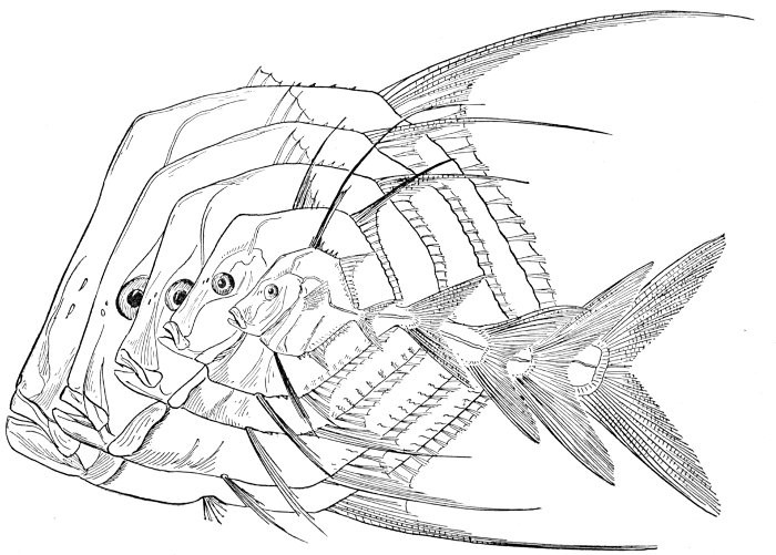 Fig. 113.—Development of the Horsehead-fish, Selene vomer (Linnæus). Family Carangidæ. (After Lütken.)