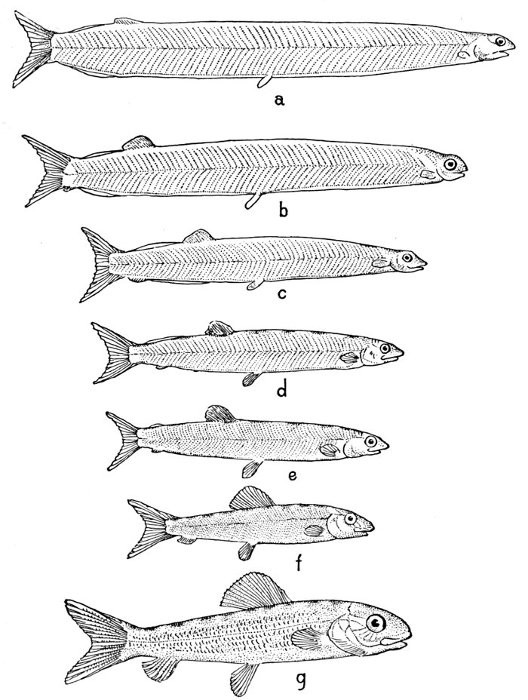 Fig. 112.—Albula vulpes (Linnæus). Transformation of the Ladyfish, from the translucent, loosely compacted larva to the smaller, firm-bodied young. Gulf of California. (After Gilbert.)