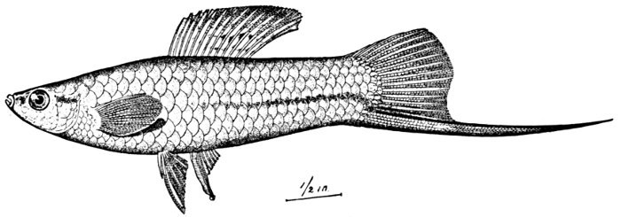 Fig. 91.—Sword-tail Minnow, male, Xiphophorus helleri Heckel. The anal fin modified as an intromittent organ. Vera Cruz.