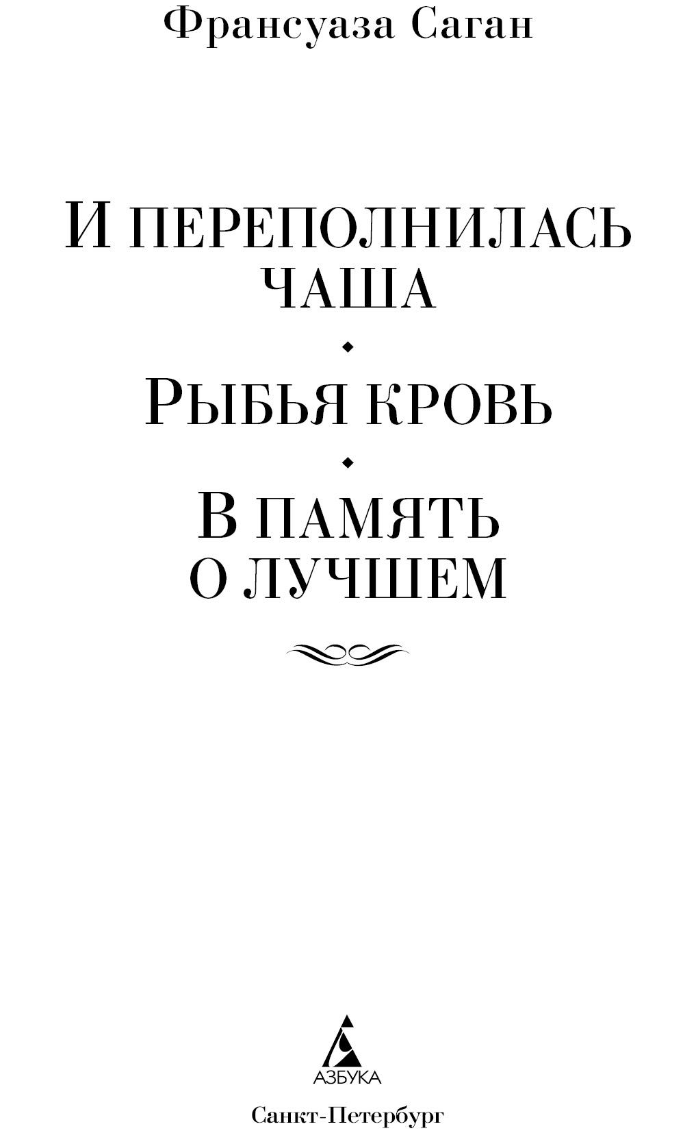 В своих книгах Саган, чутко настроенная на тонкие вибрации каждого дня, который она проживала, обращалась к историческим событиям нечасто. Однако в обоих романах, включенных в это издание, «И переполнилась чаша» и «Рыбья кровь», действие происходит в 1942 году, во время нацистской оккупации Франции, — их герои, пытаясь быть над схваткой и посреди всеобщего безумия держать иронический нейтралитет, в итоге вынуждены посмотреть в лицо фактам и выбрать сторону. А «В память о лучшем» — сборник воспоминаний Саган: о дружбе с Билли Холидей, Теннесси Уильямсом, Орсоном Уэллсом и Жан-Полем Сартром, о бурной молодости в Сен-Тропезе, о казино и книгах, о творчестве тех, кем она восхищалась, и о ее бескорыстной, беззаветной к ним любви.