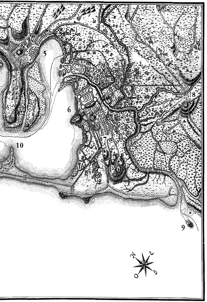 В углу полутемного кабинета, под сидящими на жердочках чучелами фазана, сокола и бородатого ягнятника, едва виднеется развернутый на столике план Кадиса, напечатанный типографским способом, подробный, с двойной масштабной линейкой — во французских туазах и испанских варах. Сверху лежат компас, линейки, чертежный угольник. План расчерчен причудливыми кривыми, которые веером расходятся из одной точки на востоке, испещрен, будто оспинами, карандашными кружками и крестиками. Кажется, что над городом растянута паутина, а все эти точки и пометки похожи на запутавшихся в сети насекомых.