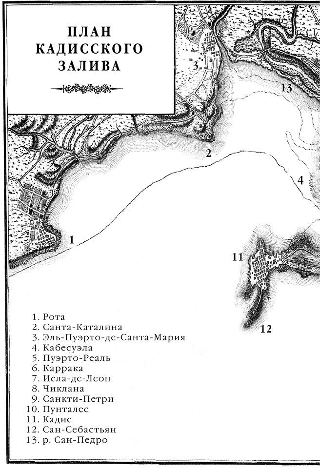 Задувавший левантинец делал воздух прозрачным и чистым, и можно было невооруженным глазом рассмотреть неприятельские укрепления на мысе Трокадеро: справа — Форт-Луис, слева — полуразрушенные стены Матагорды, а несколько выше и позади — батарею Кабесуэлы.
