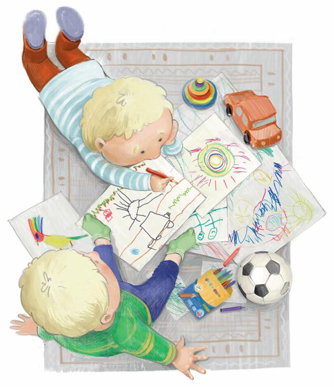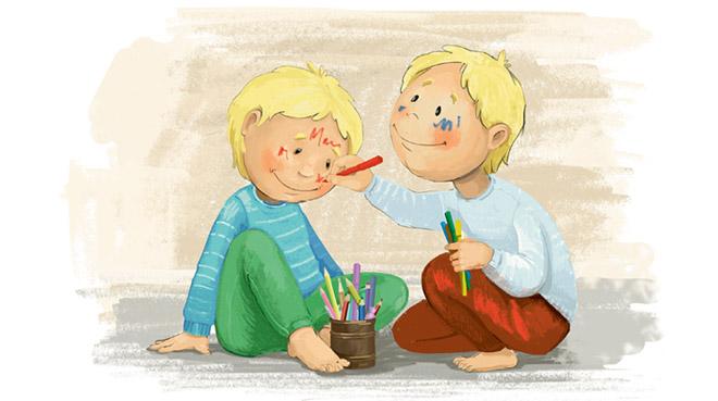 Они встают с кровати и начинают рыться в своём шкафчике с игрушками в поисках фломастеров. Найти фломастеры непросто, потому что Мадс с Митей никогда не убирают игрушки на место. Наконец Митя находит зелёный фломастер, закатившийся под диван.