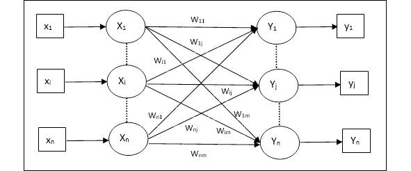 Auto Associative Memory is a single layer neural network in which the input training vector and the output target vectors are the same. The weights are determined so that the network stores a set of patterns. As shown in the following figure, the architecture of Auto Associative memory network has «n’ number of input training vectors and similar «n’ number of output target vectors[100].