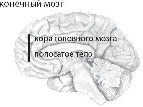 Рис. 1.3. Несмотря на то что человеческий мозг имеет те же отделы, что и мозг всех позвоночных животных, конечный мозг человека (кора мозга + полосатое тело) в несколько раз превышает размерами все остальные, взятые вместе, структуры головного мозга