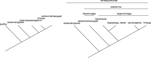 Рис. 1.4. Современная трактовка основанных на фактических данных эволюционных отношений между четвероногими позвоночными (справа), противопоставленная прежним взглядам, базирующимся на вытягивании лестницы природы вдоль оси эволюционного времени (слева). Млекопитающие (современные терапсиды) и пресмыкающиеся (современные зауропсиды, к которым относят и птиц) являются сестринскими группами. Следовательно, млекопитающие просто не могли произойти от рептилий