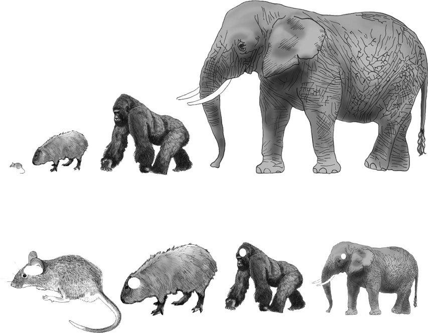 Относительно более малый мозг более крупных животных – это пример аллометрического роста или просто «аллометрии» в противоположность изометрическому росту, который бы имел место в случае, если бы у более крупных животных был пропорционально больший мозг при неизменном отношении массы мозга к массе тела. Интерес к аллометрии, учению о том, как изменяются форма тела и пропорции его частей в зависимости от размеров тела животного, можно духовно проследить до Галилео Галилея, то есть до семнадцатого века. Галилей понял, что тела более крупных животных (и их кости в особенности) не могут быть пропорционально (изометрически) увеличенными версиями тел более мелких животных, так как в этом случае они бы просто рухнули под своей тяжестью. Мы интуитивно понимаем это, глядя на слонов Сальвадора Дали с их ножками-спичками.