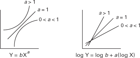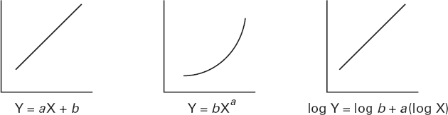 Рис. 1.6. Линейная функция, представленная в виде графика на линейной шкале (слева), степенная функция (где аллометрический показатель степени а > 1), представленная в виде графика на линейной шкале (в центре), и отношение между логарифмами величин, представленное графиком на линейной шкале (справа). Логарифмическое преобразование превращает степенную зависимость в линейную, что сильно облегчало вычисления до появления цифровых компьютеров. В аллометрических функциях X – это масса тела, а Y, как правило, масса, объем или площадь поверхности части тела
