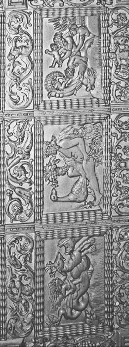Рис. 5. Три клейма с зодиаком на костяном престоле Ивана Грозного. Слева направо: 1 КЛЕЙМО – Козерог, на котором стремительно мчится всадник (Луна). 2 КЛЕЙМО – Водолей, возле которого сидит птица-Солнце. 3 КЛЕЙМО – Рыбы, где показаны остальные пять планет. А именно, Сатурн в виде бородатого Крона изрыгающего двух младенцев; Венера в виде Реи, протягивающей руки к Крону; Юпитер в виде молодого мужчины, отвернувшегося от Крона и лежащего на свинье с закрученным хвостиком; Марс и Меркурий в виде младенцев, которых изрыгает Крон. Фотография сделана нами в 2006 году с точной копии престола, выставленной в музее Александровской Слободы