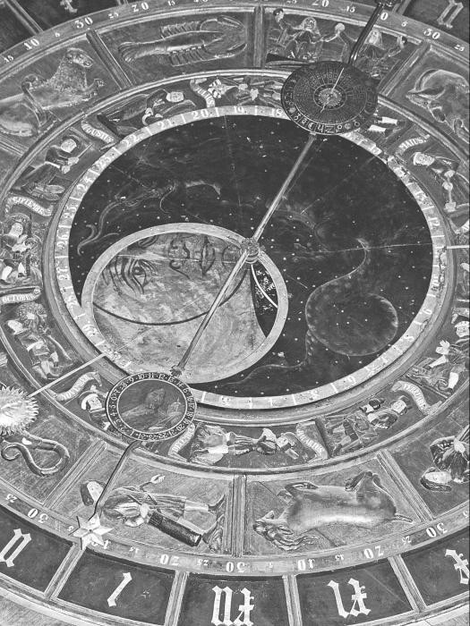 Рис. 3. Старинные зодиакальные «часы», находящиеся за алтарем собора св. Марии в городе Ростоке (Германия). Циферблат «часов» размечен фигурами зодиакальных созвездий. Каждой планете соответствует своя стрелка. Часть стрелок уже утрачено, но четыре из них сохранились. На фотографии хорошо видны три планетных стрелки. Фотография 2006 года