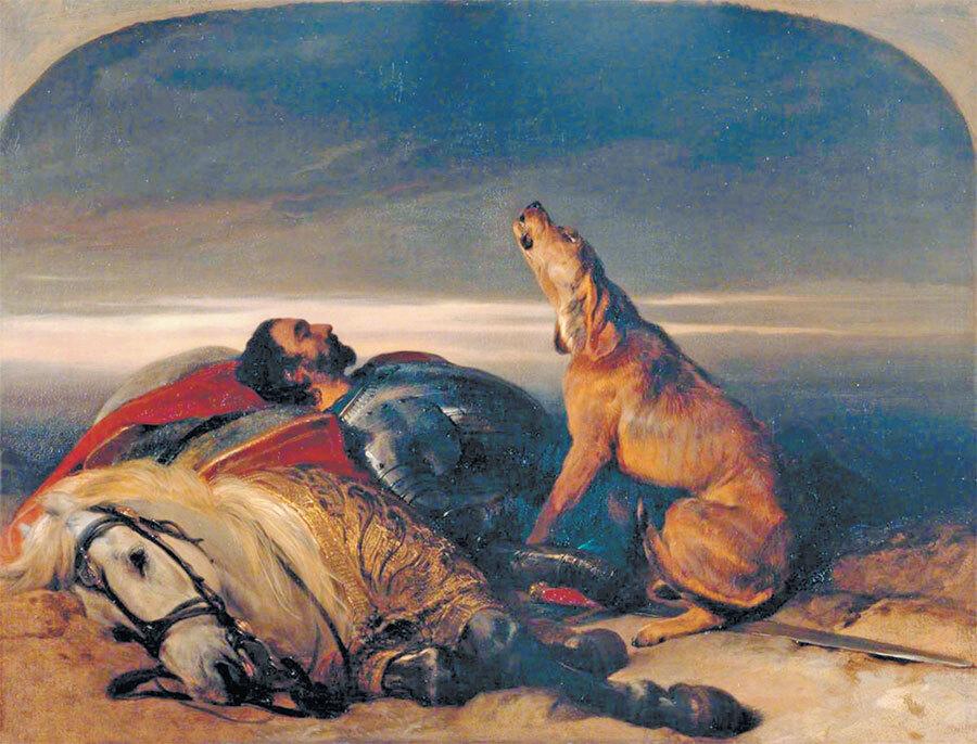 Другим распространенным литературным источником были романы Вальтера Скотта. Его произведения неоднократно становились основой для сюжетов произведений одного из любимых живописцев королевы Виктории, Эдвина Лэндсира, прославившегося также живым и натуралистичным изображением животных. Полотно «Верный пес» было исполнено по мотивам романа «Замок Опасный». Однако и здесь художник уделил основное внимание излюбленной теме: пес, воющий над телом погибшего рыцаря, несомненно является главным героем и центром всей композиции.
