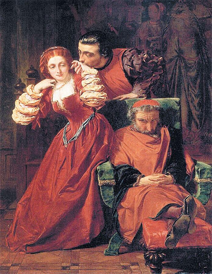 Легко узнаваемые сюжеты литературных произведений неизменно имели успех у публики. Как правило, художники избирали самые драматичные моменты шекспировских пьес. Так Альфред Элмор, работая над картиной на сюжет комедии «Два веронца» запечатлел первую сцену третьего акта, в которой герцог Миланский догадывается о любви своей дочери Сильвии к молодому дворянину Валентину: