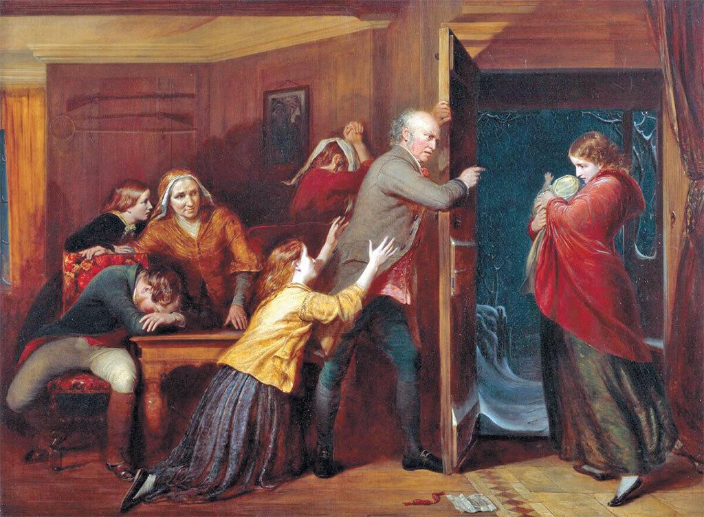 Драматизм сцены усиливают брошенные на пол кошелек с деньгами – викторианская вязаная монетница – и обличительное письмо, гравюра с изображением изгнания Агари на стене, буря, бушующая за дверью и протянутые в мольбе руки девушки. Возможно, прообразом героини этого произведения стала родная сестра Редгрейва, которой было отказано от дома. Девушка, вынужденная работать гувернанткой, быстро угасла и умерла в 1829 году.