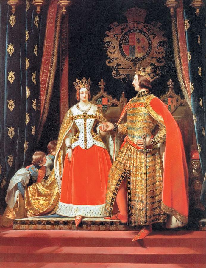 Костюмированный бал в королевском дворце вызвал у критики и публики противоречивые чувства – и восторг и осуждение. Причем за одни и те же качества – за пышность и экстравагантность зрелища. Две тысячи человек съехались 11 мая 1842 года в Букингемский дворец, на оформление которого было потрачено 100 000 фунтов стерлингов. Королева Виктория была одета в платье, украшенное драгоценными камнями и горностаевым мехом, которое было создано по мотивам одеяний надгробных статуй королевы Филиппы и Бланш де ла Тур в Вестминстерском аббатстве. Костюм принца-консорта Альберта был скопирован с одежд надгробного изваяния короля Эдварда III: длинное сюрко (средневековое одеяние наподобие туники) из парчи и красная бархатная мантия. Это торжество было запечатлено в картине сэра Эдварда Лэндсира, члена Королевской Академии художеств. В картине «Королева Виктория и принц Альберт в виде королевы Филиппы и Эдварда III на костюмированном балу» он изобразил момент, когда монаршая чета вступила в зал и приготовилась занять свое место на троне. Композиция подана наигранно, как всякое театрализованное действо, пышно и безжизненно, в духе парадного портрета с намеком на живопись Рубенса.