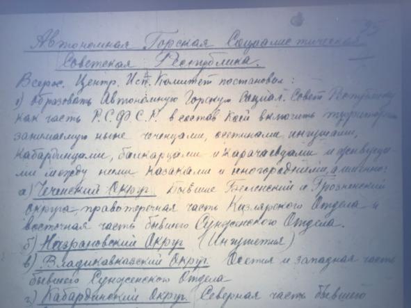 Постановили: Заслушав доклад тов. Орджоникидзе о необходимости более точного разъяснения по вопросу о распределении земли между Горским населением /чеченцами/ и казаками, Президиум ВЦИК постановляет: