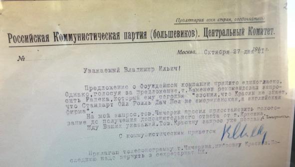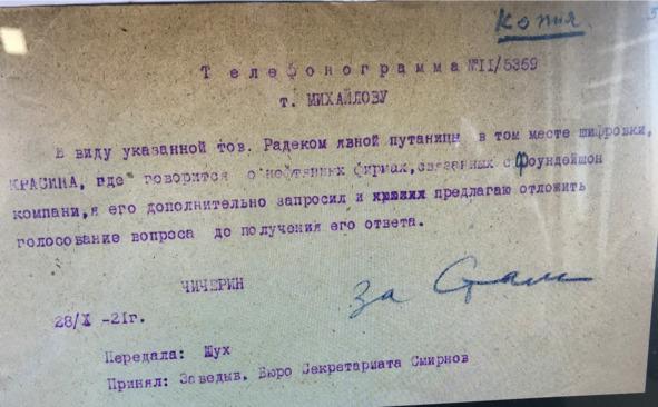 В виду указанное тов. Радеком явной путаницы в том месте шифровки, Красина, где говорится о нефтянных фирмах связанных с фоундейшон компани, я его дополнительно запросил и предлагаю отложить голосование вопроса до получения его ответа. 28 октября — 1921 год. Чичерин.