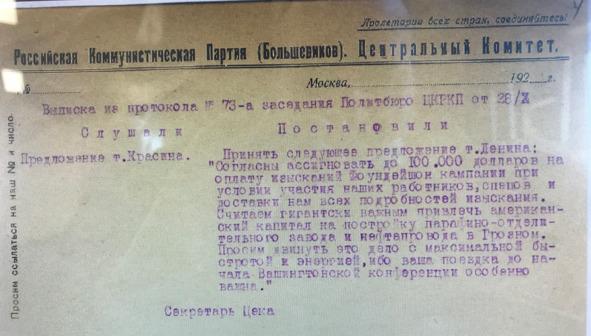 Лист 4. Выписка из протокола №73-а заседания Политбюро ЦКРКП от 28 октября. Слушали Постановили: «Принять следующее предложение тов. Ленина. «Согласны ассигновать до 100.000 долларов на оплату изысканий фоундейшон кампани при условии участия наших работников, спецов и доставки нам всех подробностей изыскания. Считаем гигантски важным привлечь американский капитал на постройку парафино-отделительного завода и нефтепровода в Грозном. Просим двинуть это дело с максимально быстротой и энергией, ибо ваша поездка до начала Вашингтонской конференции особенно важна». Секретарь ЦК.