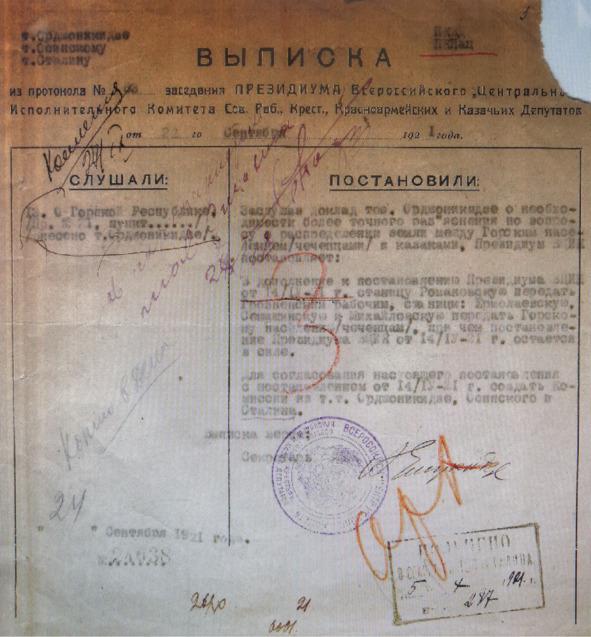 Протокол Политбюро №42 от 14 сентября 1920 года. Пункт 1: Доклад Сталина и Фрумкина о настроении кавказских горцев. Решено: а) подтвердить постановление Кавбюро ЦК о наделении чеченцев землей за счет казачьих станиц и признать необходимым проведение мер для свободной деятельности горцев и создания между ними и русскими правильных отношений на основе полной автономии; просить Пленум ЦК определить эти меры; б) Признать необходимой после сессии ВЦИК поездку Сталина на Кавказ для определения нашей политики на Кавказе вообще и горцев в особенности; в) Поручить Кавбюро ЦК оповестить горские горисполкомы о предстоящей поездке Чрезвычайного уполномоченного представителя РСФСР; г) Поручить Оргбюро подыскать работников для Кавказа и для Владикавказа.