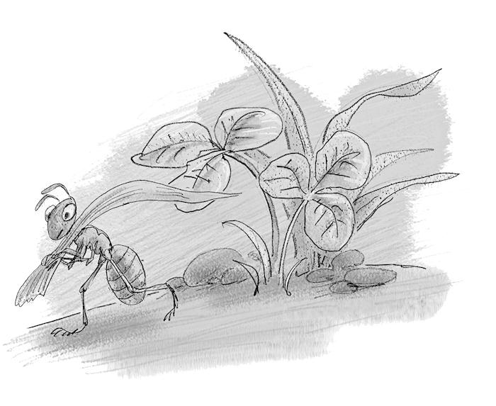 В это время муравей тащил на спине сосновую иглу и остановился отдохнуть.