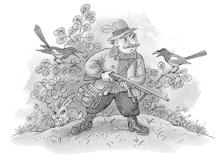 Вот идёт охотник. Невтерпёж первой сороке. Завертелась она, захлопала крыльями.