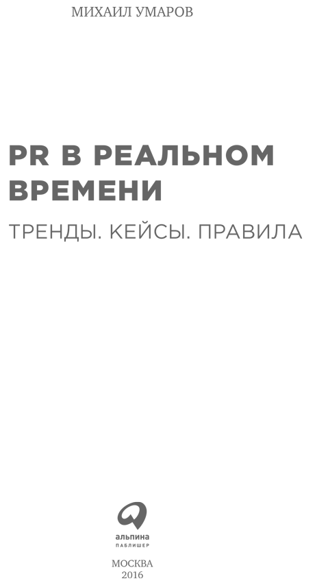 Новая книга Михаила Умарова «PR в реальном времени» — вдохновляющий учебник о деловых коммуникациях в период всеобщей миграции в цифровую среду. И речь в нем в первую очередь не об инструментах PR, рекламы и маркетинга, а о том, как бизнесу осознать свою ценность для общества и научиться делиться этой ценностью с правильной аудиторией, правильными способами, в правильные моменты жизни и в итоге устанавливать правильные длительные отношения. Книга будет полезна как предпринимателям, так и специалистам рекламно-коммуникационного рынка.