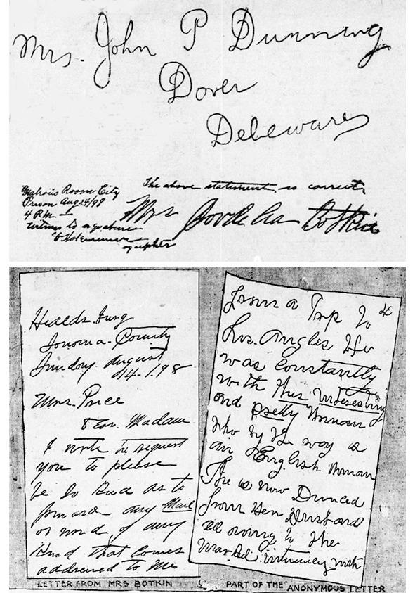 Детектив МакВей допросил Даннинга и предъявил ему письменные улики, осведомившись, не узнаёт ли журналист руку писавшего. Даннинг бодро отрапортовал, что узнаёт. По его мнению, надписи на упаковке бандероли и письмо, полученное утром 9 июня, оставлены Корделией Боткин (Cordelia Brown Botkin), его любовницей. У этой дамочки он арендовал квартиру в начале 1898 года, она им увлеклась и совсем потеряла голову. Отправляясь в конце апреля на войну, Даннинг заявил ей, что намерен воссоединиться с семьёй, а потому ждать его обратно не следует, он не приедет! По-видимому, Корделия Боткин пришла от услышанного в ярость и таким вот образом решила отомстить ему и одновременно убрать с пути соперницу. Детектив, разумеется, осведомился: имеются ли на руках журналиста образцы свободного почерка упомянутой Корделии Боткин и может ли тот передать их следствию для сличения почерков? Даннинг продемонстрировал готовность во всём сотрудничать с правоохранительными органами, он ретивым кабанчиком метнулся в гостиницу и в скором времени вручил МакВею несколько писем, написанных Корделией. Сразу поясним, что переданные письма представляли собой лишь незначительную часть переписки журналиста с любовницей, и в то время никто так и не узнал ни размера этого эпистолярного наследия, ни его содержания.