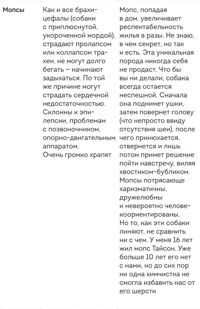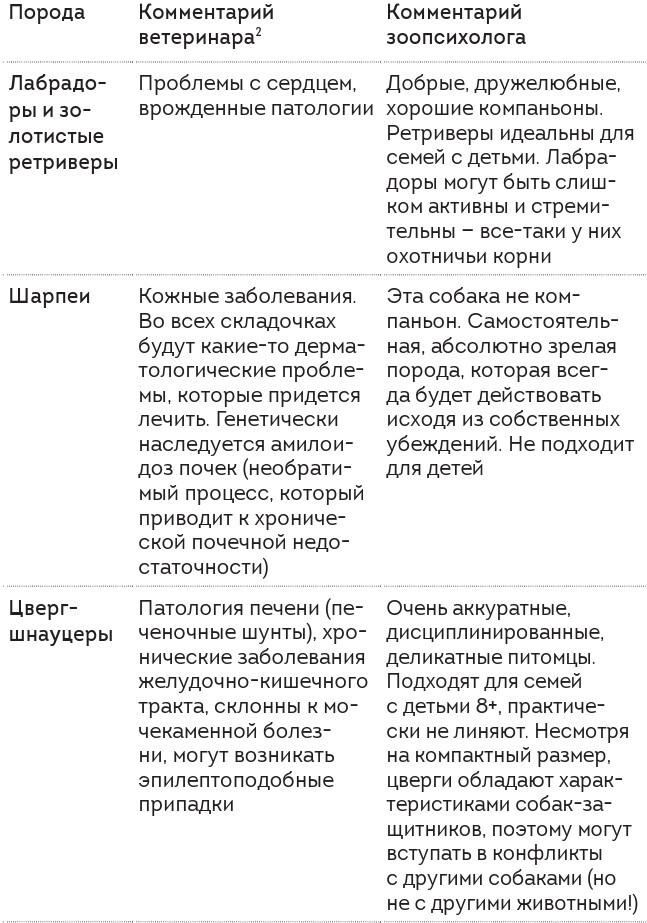 Я не хотела давать какое-то подробное описание пород – все же моя книга не об этом, но редакторы уговорили составить таблицу. Из нее вы узнаете, о чем стоит помнить при выборе той или иной породы с точки зрения ветеринарии и зоопсихологии.