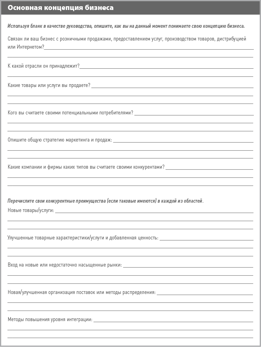 Успешный бизнес-план не только гарантирует достижение краткосрочных целей. Он способствует повышению жизнеспособности вашего бизнеса в долгосрочной перспективе. В процессе составления плана учитывайте ключевые факторы успеха бизнеса и личной удовлетворенности. Удостоверьтесь в том, что вы имеете понятную и сфокусированную концепцию бизнеса, а границы вашего рынка четко очерчены. Осмыслите основные тенденции развития вашей отрасли в национальном и глобальном масштабах и разработайте процедуры управления, позволяющие быстро реагировать на изменения и дисциплинирующие сотрудников.