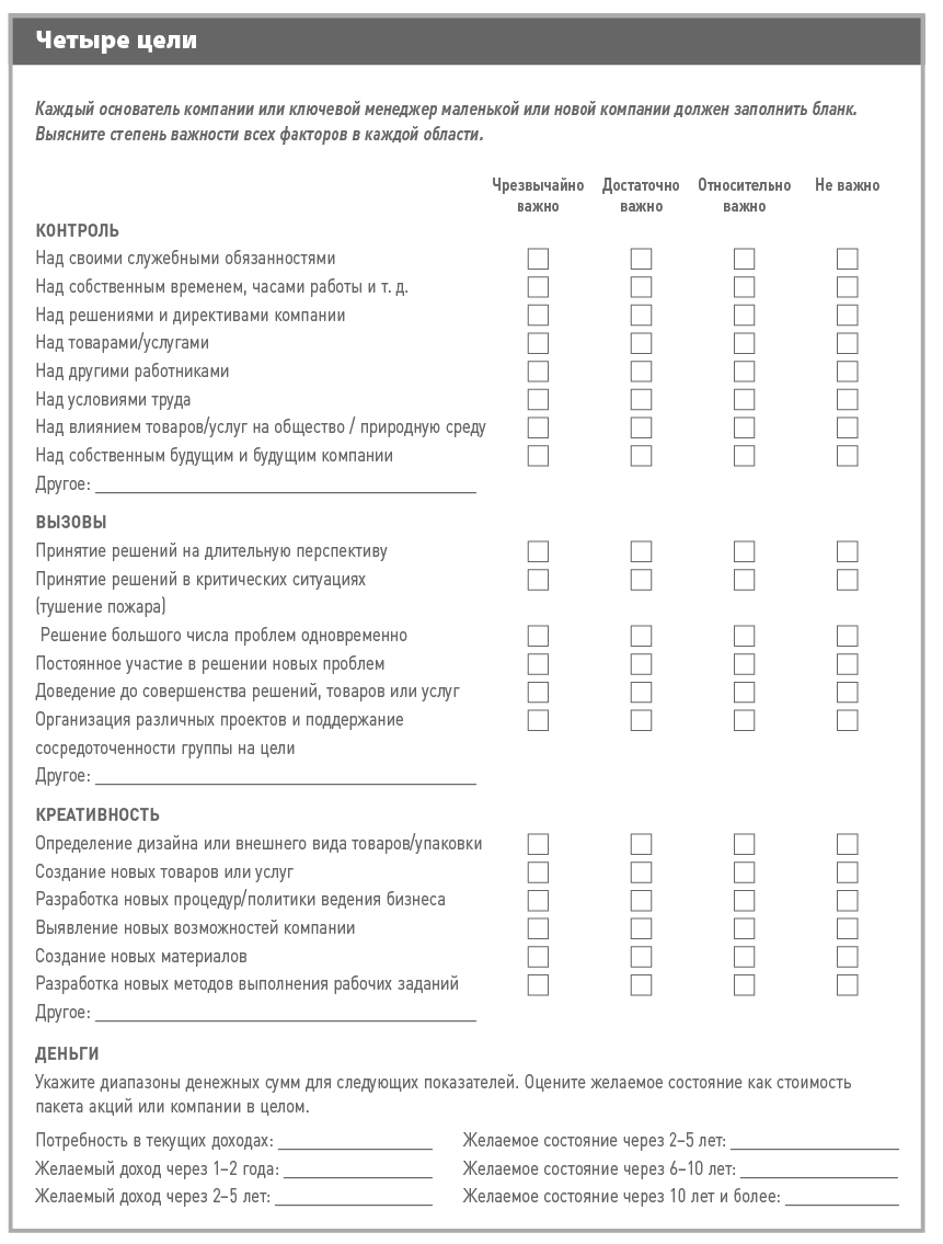 Используя бланк для исследования четырех основных личных целей, проанализируйте свои индивидуальные цели и цели ключевых сотрудников.