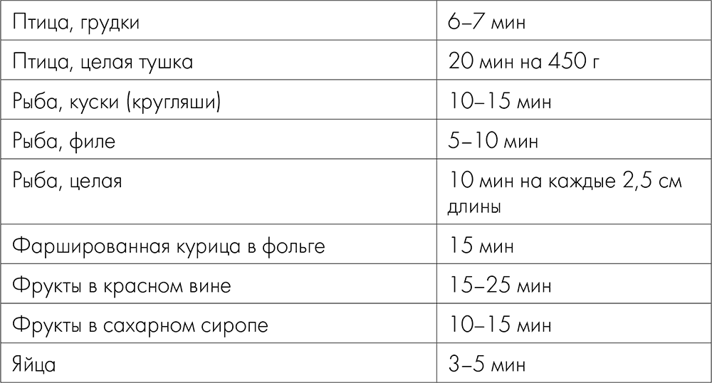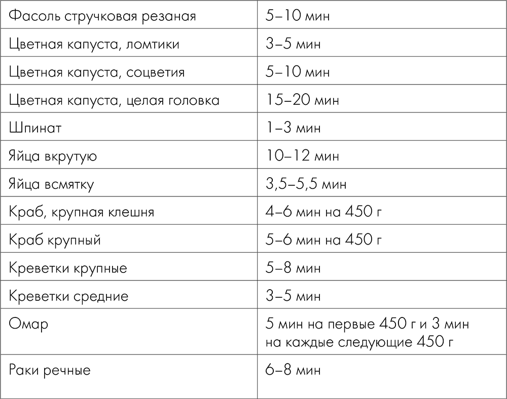 Поскольку после закладки овощей, морепродуктов или яиц температура воды понижается, время варки (см. таблицу) начинают отсчитывать от момента, когда вода снова закипит.