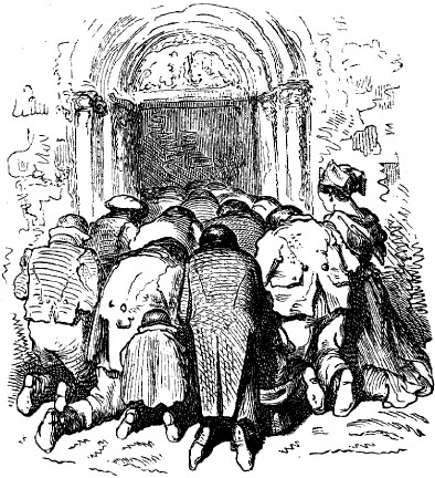 Это звонили к ранней обедне. В то время ранняя обедня начиналась чуть ли не тогда, когда еще кричали вторые петухи. Сквозь неясный, еле колеблющийся просвет раннего утра с трудом можно было разобрать очертания черных фигур, направлявшихся к паперти церкви. То были нищие и богомольцы. Ворча, ругаясь, толкая друг друга, изрыгая отвратительную брань, нищие и нищенки спешили поскорее занять свои места, боясь, как бы кто другой, более нахальный и сильный, не перехватил «теплого» уголка.