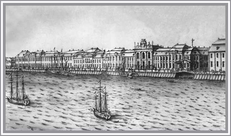 Но жизнь не стояла на месте. Город стремительно развивался. Всего четыре года прожило царское семейство в Свадебных палатах, а Петр уже затеял новую стройку. И вот почему (по крайней мере, так считал один из первых историков Петербурга Андрей Иванович Богданов): «…когда начала строиться набережная Миллионная линия каменными палатами, тогда оная линия строением подалась на Неву реку на несколько сажен, то помянутые палатки прежнего строения (Свадебные палаты. – И. С.) остались во дворе». А его дворец не должен был отступать от устанавливающейся красной линии, следовало ему стоять не в глубине двора, а вровень с другими дворцами. Так в итоге и получилось, судя по рисунку Маттарнови, изобразившего набережную Невы, известную нам как Дворцовую, в 1725 году.