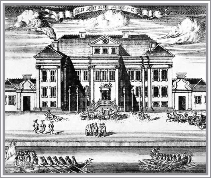 Что же касается Свадебных палат, то это был уже не скромный маленький домик. Это был дворец – небольшой, но удивительно красивый. Впрочем, что ж удивительного: рука великого Трезини. Его безупречное чувство пропорций, сдержанность, легкость – гармония. Мы видим «Зимней Дворец», чаще именуемый Свадебными палатами, на гравюре Алексея Федоровича Зубова (1716 год).