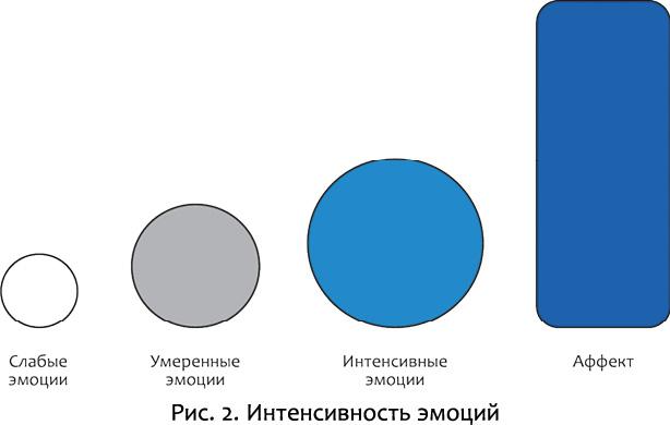 Все эмоциональные состояния делятся по своей интенсивности. Самый низкий уровень — это слабые переживания. Ими легко управлять, и человеку для этого требуется лишь минимальное усилие. Например, свое недовольство кем-то (или чем-то) в норме человек способен отложить, удержаться его от выражения, осмыслить, перенести на позднее, более подходящее время, когда он будет чувствовать себя в безопасности или будет уместно о нем заявить. На рис. 2 изображены эмоции в своем проявлении — от слабого к аффективному.